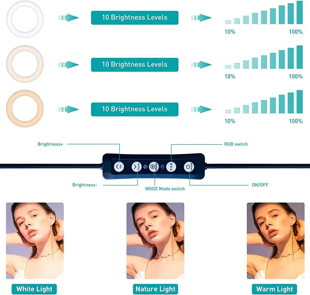 The led ring light is with 3 color lights modes: white/ warm white/ warm light, 3000-7000K, and 10 adjustable brightness for each color. 26 adjustable colors in RGB mode, Perfect dimmable brightness and colors meet all your needs.